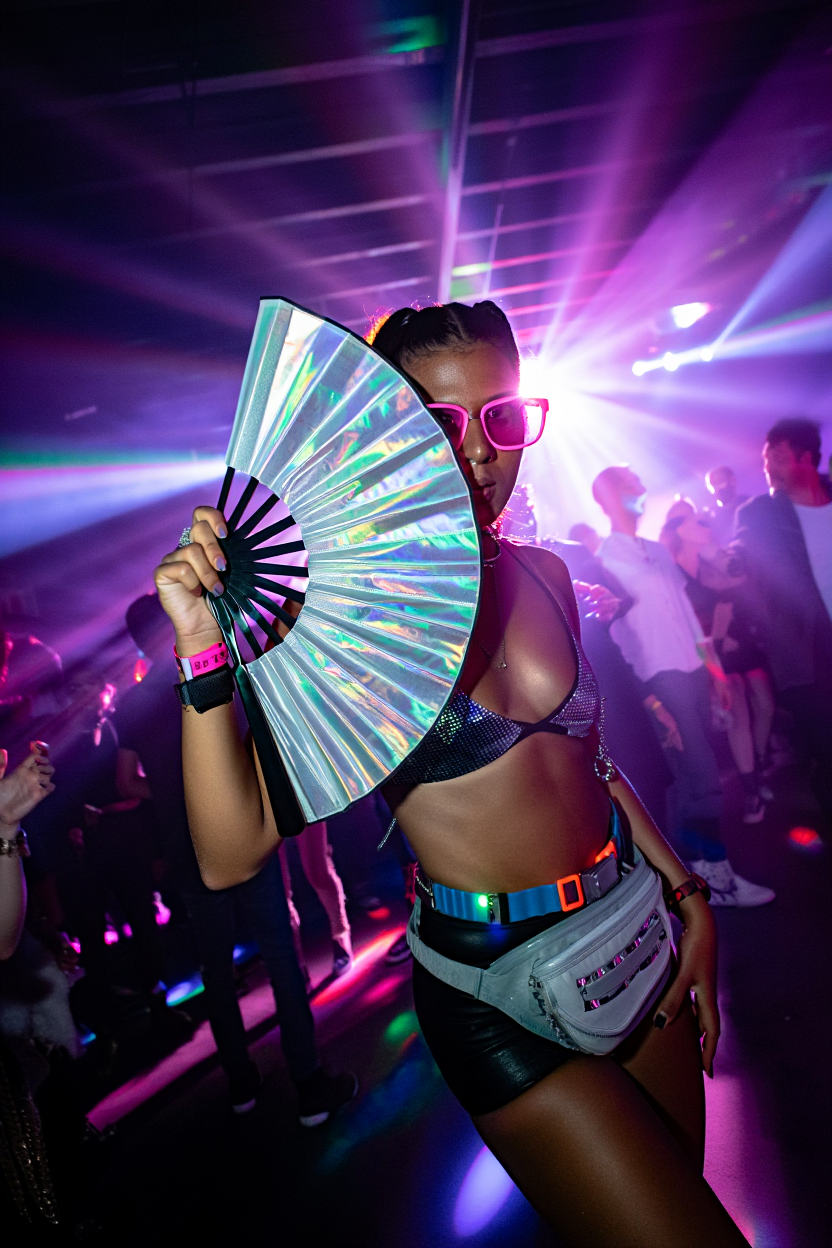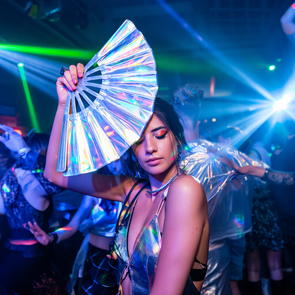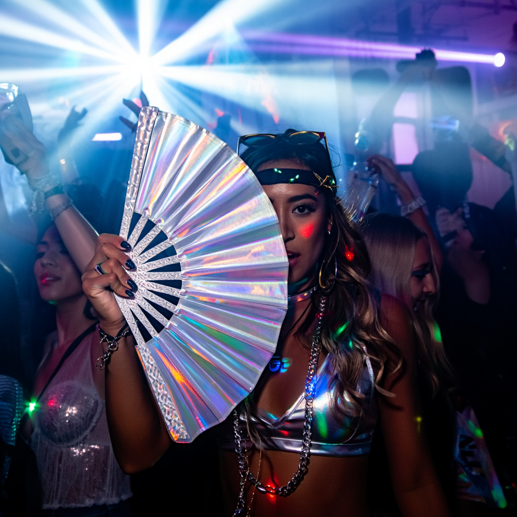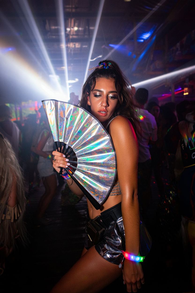 El Abanico no solo añade un toque de estilo a tu look, sino que también te ayuda a mantenerte fresco mientras disfrutas de la música y el ambiente. Su diseño iridiscente y holográfico te permite disfrutar de un efecto visual único que resalta en la multitud sin ser excesivamente llamativo.