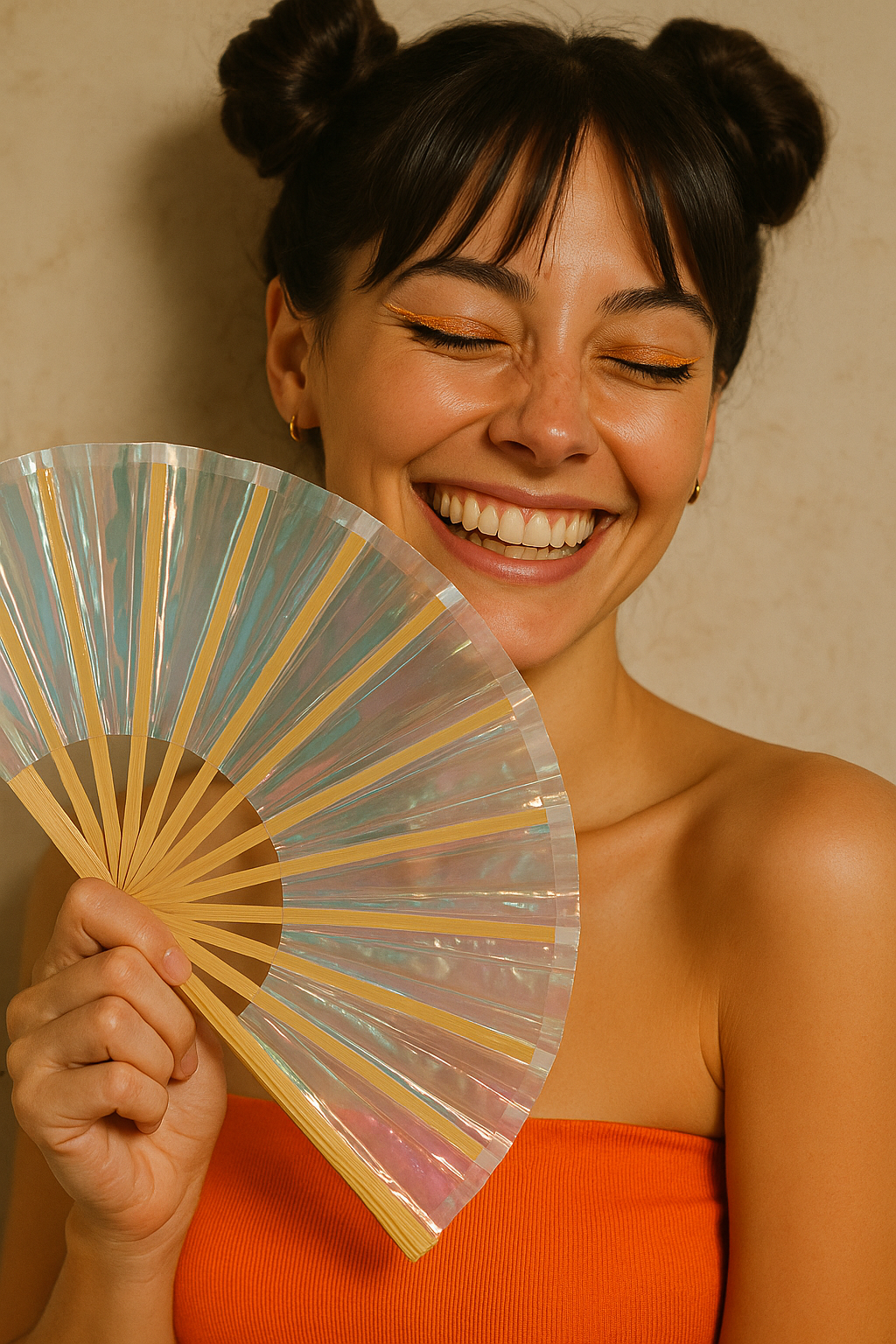 El Abanico no solo añade un toque de estilo a tu look, sino que también te ayuda a mantenerte fresco mientras disfrutas de la música y el ambiente. Su diseño iridiscente y holográfico te permite disfrutar de un efecto visual único que resalta en la multitud sin ser excesivamente llamativo.