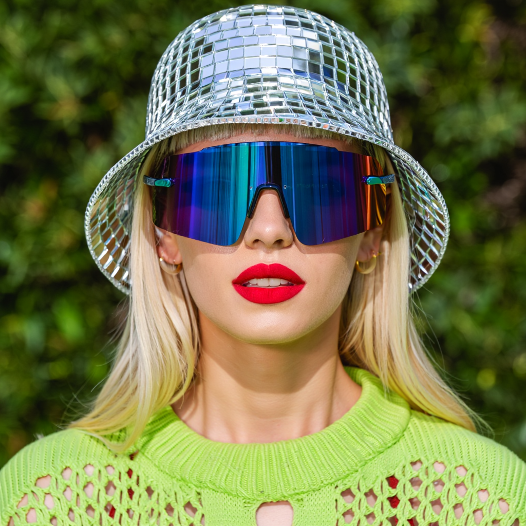 El sombrero está diseñado con mini espejos reales. Ofrece un cordón para llevarlo ajustado y seguro.