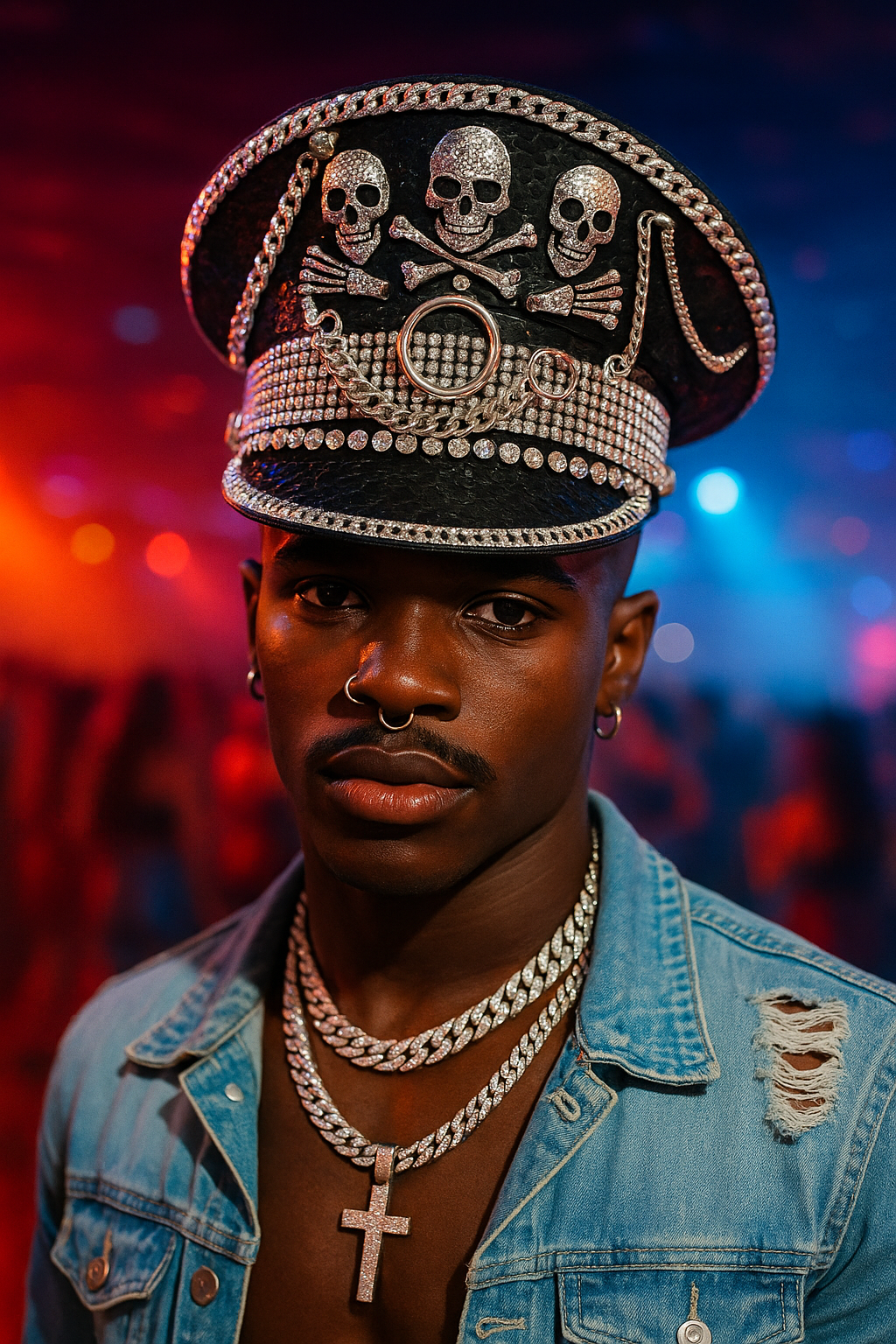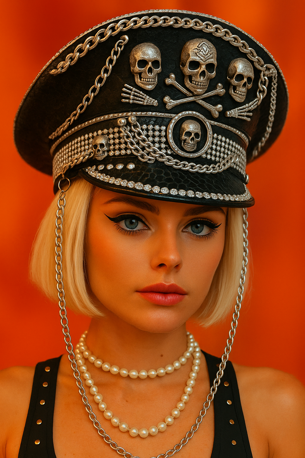 Este sombrero esta hecho a mano, su diseño con patrón de calavera, remaches de cadena y lentejuelas lo convierte en un accesorio audaz y llamativo.